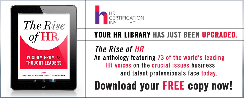 More than ever, leaders of nearly every kind of organization view their human resources teams as essential to institutional well-being and long-term growth and sustainability. That’s the central and animating theme of “The Rise of HR: Wisdom from 73 Thought Leaders,” a new anthology published by the HR Certification Institute in collaboration with Dave Ulrich, Rensis Likert Professor of Business, University of Michigan and Partner and Co-founder of The RBL Group, Bill Schiemann, CEO, Metrus Group, Inc. and Libby Sartain, Business Advisor, Board Member and Volunteer. In the eBook, the essayists address how increasing numbers of HR professionals are – and should be – the principal stewards of their organizations’ talent by recruiting and cultivating workers with competence and motivation to perform well, by building and maintaining a consistent, lasting and unique culture that enables the organization to thrive and leadership to support the acquisition of skills for meeting short-run goals and delivering long-run stability and growth. Collectively, the essays describe how HR practitioners must live up to and even extend expectations of their profession’s growing and evolving role. They focus on how HR professionals and the tools they use must adapt to shifts in demographics and the impacts of technology on the workplace.